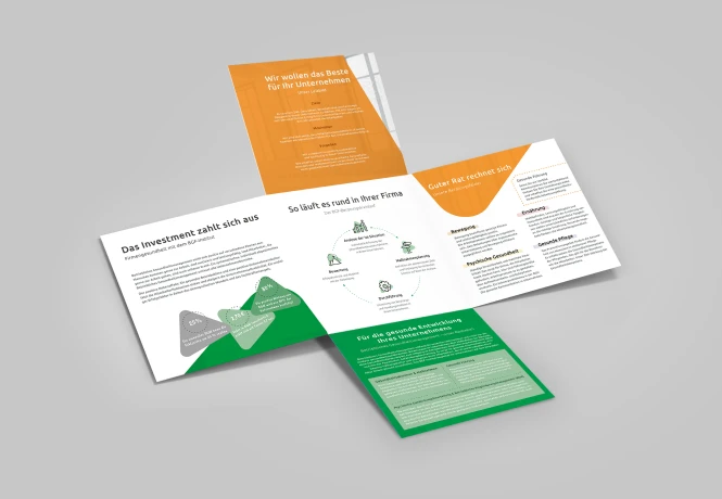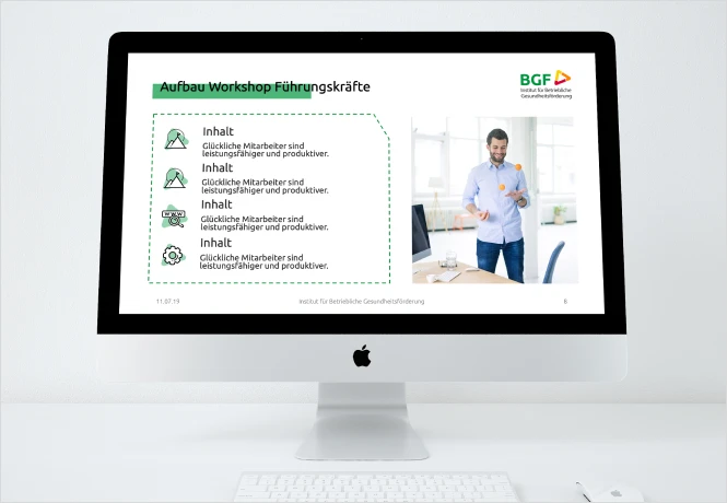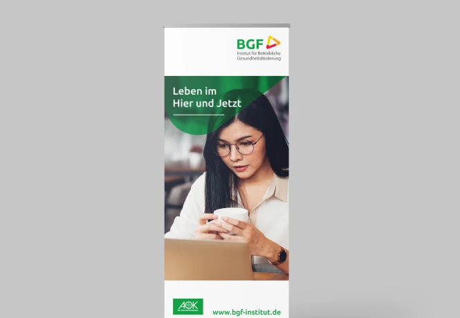 Einen umfassenden Corporate Relaunch durften wir für das Institut für Betriebliche Gesundheitsvorsorge – kurz BGF – durchführen. Hierfür kreierten wir eine völlig neue Gestaltungswelt, die mit den gemeinsam zuvor im Workshop erarbeiteten Firmenwerten deckungsgleich war. Individuell, wiedererkennbar und kompakt – all das kommunizieren wir mit dem neuen Corporate Design. Als Herzstück setzten wir zuerst eine neue Imagebroschüre um, in der alle neuen Gestaltungselemente zusammengeführt wurden. Danach folgte die Umsetzung der Geschäftsausstattung, eine Powerpoint-Vorlage, zahlreiche Flyer und Postkarten, Ausstellungswände und vieles mehr. Im weiteren Verlauf der Zusammenarbeit kamen jährliche Berichte, das Design einer App sowie die Entwicklung weiterer Submarken hinzu.