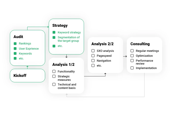 Our SEO services range from technical analysis, keyword strategies, content optimization, and mobile SEO to backlink analysis, monitoring, and reporting. All measures are modular and can be flexibly combined.