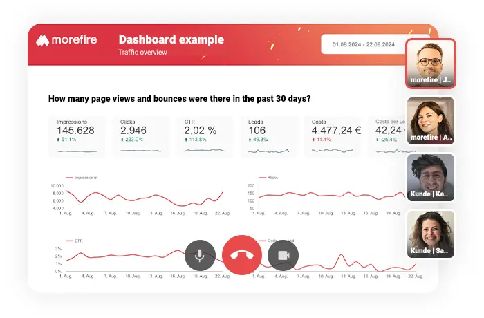 The costs depend on your goals, the starting point, and the scope of the measures. Of course, we create individual SEO offers — but at morefire, we don’t think in silos. As a holistic online marketing agency, we always consider SEO in combination with other channels. This allows us not only to make you a suitable offer, but also to uncover potential that goes beyond classic SEO measures.