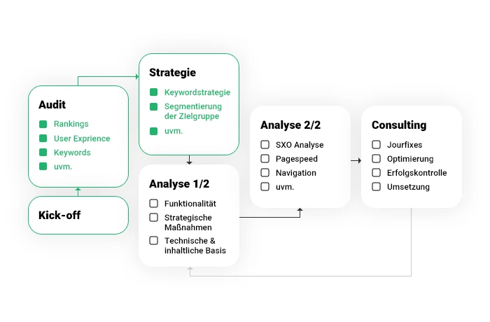 Viele Unternehmen kommen mit dem Wunsch nach gezielter SEO-Unterstützung zu uns – und genau da steigen wir ein. Doch bei uns endet SEO nicht bei Rankings oder Keyword-Positionen. Als ganzheitliche Online-Marketing-Agentur denken wir Suchmaschinenoptimierung immer im Zusammenspiel mit Content-Strategie, Paid Media, UX und Webanalyse. Denn eine gute Platzierung bei Suchmaschinen wie Google, ist nur dann etwas wert, wenn sie auch Ergebnisse liefert – in Form von qualifizierten Besuchern, Leads, Conversions, Verkäufen oder nachhaltigem Wachstum.