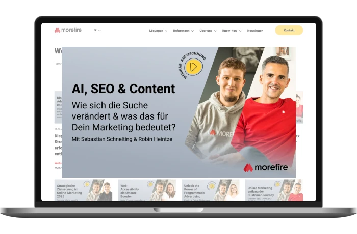 KI verändert alles – natürlich auch die Art und Weise, wie Konsumenten im Internet suchen. Das hat unmittelbare Auswirkungen auf Dein Marketing. Denn wenn Du Deine Maßnahmen nicht an diese neue Herausforderung anpasst, verlierst Du schneller den Anschluss, als Du „ChatGPT“ sagen kannst. morefire-Geschäftsführer Robin Heintze verrät Dir im Gespräch mit Sebastian Schnelting, wie Du Dein Content Marketing an diese Entwicklungen anpassen kannst, um weiterhin sichtbar und relevant zu bleiben
